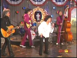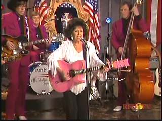 After a commercial break, Eddie Stubbs promoted The Marty Stuart Collection of five CDs, Live at the Ryman, Badlands, Compadres: An Anthology of Duets, Cool Country Favorites and Souls' Chapel. He introduced Marty. Marty said to Wanda Jackson, "Hey, thank you for coming to see us and you know what, congratulations on your induction to the Rock and Roll Hall of Fame." Wanda said, "How 'bout that. Thank you very much. Thanks" Marty continued, "Why don't you do one of those big ole snazzy hits that got ya started to get you to the Rock and Roll Hall of Fame." Wanda said, "Okay." Marty continued, "All right." Wanda said, "Yeah, just the key of G to start." Marty said, "Little chord." Wanda let out a note and said, "Somethin' like that?" Marty said, "That's the one." Wanda rocked the house on, "Let's Have A Party."