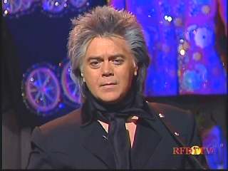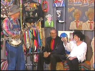 Eddie said, "Wow, a lot of history right there. That song's a country standard. Wanda Jackson first had it on record back in 1956. 'Silver Threads And Golden Needles' and she and Connie Smith doin' it for us today. Boy that's special. Thank y'all." Eddie promoted Connie's boxed set Born To Sing. After a commercial break, Marty said, "Well, it's time for the Sultan of Goodlettsville. Are you ready?" Hank Singer said, "I'm ready." Marty continued, "He's ready. The Sultan of Goodlettsville, ladies and gentlemen, the most popular man in country music, the ole Tennessee Slicker, make him feel welcome. Leroy Troy. How 'bout it for Leroy. Jump in there, Hank. Hello, Leroy." Leroy: "Hello Marty." Marty: "Sure is good to see ya." Leroy: "You, too." Marty: "What's the good word from Goodlettsville?" Leroy: "Tell ya what." Marty: "Tell me what?" Leroy: "I found Wanda." Marty: "You found her, didn't ya." Leroy: "There she is." Marty: "Finally found her. Finally found her and a precious one she is." Leroy: "She sure is." Marty: "Well, what do you wanna sing her?" Leroy: "How 'bout 'The Streamline Cannonball'." Marty: "One of the precious songs of all time." Leroy: "Rock it down the track."