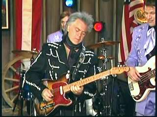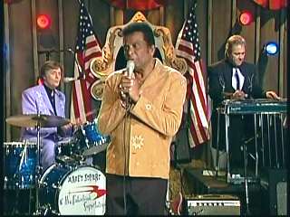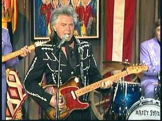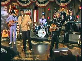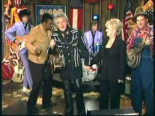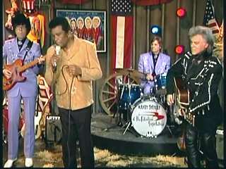 Eddie Stubbs said, "Powerful lyric and a powerful delivery there from Marty Stuart. Thank you, sir." Eddie promoted Marty's book of photographs, Country Music: The Masters. After a commercial break, Marty said, "Welcome back. So glad you could join us. Now, I'm always proud to tell ya this show is sponsored by the good people in the great state of Mississippi. Mississippi is called the Birthplace of America's Music. And people come from all over the world to be part of the atmosphere in which the Magnolia State's music has been created. If you've never been, I'd like to invite you to come to Mississippi and share in the feeling of our music. Two music trails run throughout the state and will serve as your guide. The Blues Trail and the Country Music Trail with stop number one being the Father of Country Music, Jimmie Rodgers' marker in Meridian, Mississippi. Jimmie's marker is just one of well over 100 stops along the way. And we're nothin' close to bein' finished. Now stay tuned because a little later in this program's broadcast, I have some good news to tell ya concerning the Country Music Trail. Meanwhile, how 'bout a hand for our friends in Meridian, Mississippi, the town with the most Blues and Country Music Trail markers. Apostle?" Paul said, "Yes, sir." Marty continued, "Mr. Pride, speakin' of trails, here's a trail blazer from way back. The ole Sultan of Goodlettsville, the Tennessee Slicker, the most popular man in country music. How 'bout a hand for Leroy Troy, everybody. You know Connie, Apostle, Hank, Charley Pride."