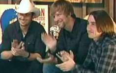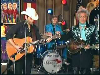 After a commercial break, Eddie Stubbs promoted the Marty Stuart Tribute Revolver. Eddie said, "And once again, here is Marty Stuart." Marty said, "Thank you, Eddie Stubbs. How 'bout a hand for Eddie Stubbs. What do ya think about him, Brad?" Brad said, "I think he's the best in the world." Marty said, "Me too. And I think you're great." Brad said, "You too." Marty continued, "You're makin' a lot of people happy out there right now." Brad said, "Well, I hope so." Marty said, "You are." Brad said, "That's the goal." Marty said, "And I tell ya what. You're doin' a great job for country music. Thank you very much." Brad said, "Thanks for sayin' that. So are you." Marty said, "And look-a-here. You got 'em out of jail just to bring 'em." Brad said, "I know. Look at those guys." Marty said, "Kendal and Justin." Brad said, "And thank you for puttin' this show on the air. What a great thing." Marty said, "Well, thank you for comin' by to do it. That's what keeps it goin'. Sing a big hit, would ya?" Brad said, "I'll try." Marty said, "Whatcha got? Mr. Brad Paisley, ladies and gentlemen." Brad sang "Anything Like Me."