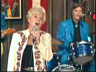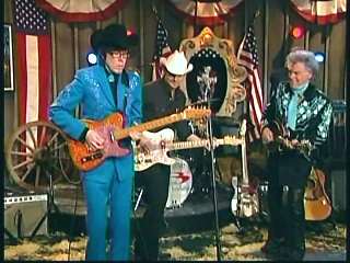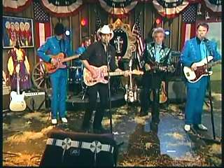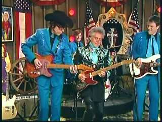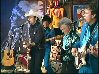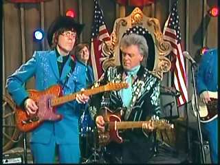 Eddie promoted Marty's book of photographs, Country Music: The Masters. After a commercial break, Marty, Paul and Harry were on stage. Marty said, "Welcome back, ladies and gentlemen. Whataya think, Brad. Well all right. Superlatives?" Paul and Harry answered, "Yes." Marty continued, "Always good news to tell ya that The Marty Stuart Show is sponsored by the good people of the great state of Mississippi. Now, Handsome Harry." Harry said, "Yes." Marty went on, "195 miles due north of the romantic river town of Natchez, Mississippi, is a town that's near and dear to my heart. Hometown, Philadelphia, Mississippi. And just outside of Philadelphia is the Pearl River Resort. Visitors come from all over to visit the Silver Star Casino, eat good food, play golf at the Dancing Rabbit Golf Course, and attend concerts like Brad Paisley at the Golden Moon Event Center. Pearl River Resort is part of the Choctaw Reservation surrounded by majestic pine trees, azaleas, with lots of friendly people that'll make ya feel welcome. You can relax and do nothin' at Pearl River or hit the bright lights and stay up for a week. It's your call. But just in case you do stay up for a week and the slot machine accidentally takes all your money, go see my friend Jackie Chan over at Philadelphia Gun and Pawn. He'll work out somethin' for ya to getcha home, I'm sure. He's a good man. Give him a hand in Philadelphia. That's right. Speakin' of good fellas, here he comes, Brad. The Sultan of Goodlettsville, the ole Tennessee Slicker, how 'bout a hand for Leroy Troy. Come here, Leroy. Look here. Superlatives, Connie, Brad and the boys. Well."