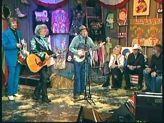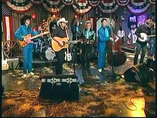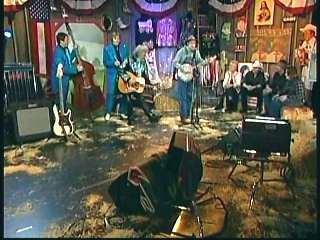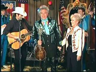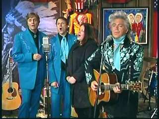 Marty said, "Almost nailed it." Eddie Stubbs said, "Leroy Troy right there and 'Country Music's Gone To Town'. Well, whether you're from out in the country or from the city, the songs of inspiration are some of the most requested that we do here on this show. Marty Stuart wrote a brand new one. As a matter of fact, it makes its debut on this particular performance. And he had in mind Lorrie Bennett, the daughter of Anita Carter and the granddaughter of Mother Maybelle Carter, to sing the high harmony on this. She's gonna join Handsome Harry and the Apostle Paul. Marty's gonna lead this one. 'His Love Will Lead Us On'."