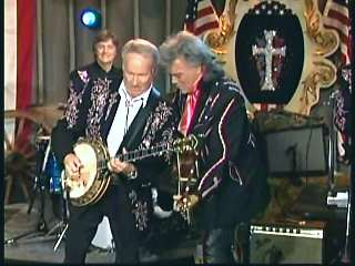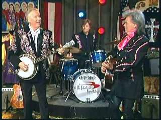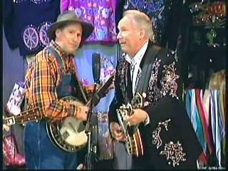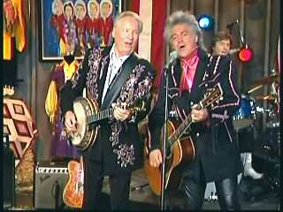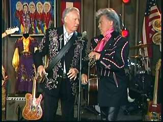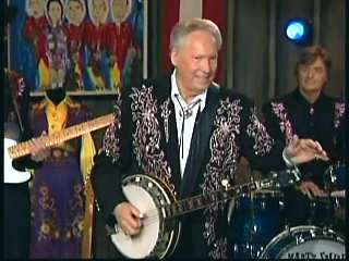 Marty said, "How 'bout a hand for ole Buck Trent. Come here, Buck. Glad you're here." Buck said, "Oh yeah. Ole Buck Trent." Marty said, "Ole Buck Trent." Buck said, "Ole Buck Trent." Marty said, "The reason I say that is ole Buck Trent's been in my life for a long time and I love Buck Trent. I love you." Buck said, "Oh thanks. I love you, too." Marty continued, "Watchin' you on TV growin' up in Mississippi on The Porter Wagoner Show, all of you .... the entire cast. It was great." Buck said, "You was a kid really." Marty said, "You were, too." Buck said, "I've got shoes older than you." Marty and Buck laughed. Buck said, "I went with Porter from '62 to '74." Marty said, "Well, ya'll made a lot of great records. And there's one song in particular that when it would come along, Porter and Dolly would do it." Buck said, "That's right. It was a big hit for 'em." Marty said, "Yes it was. And you made it a big hit with that banjo." Buck said, "Whoa." Marty said, "How 'bout we do this one right here.Superlatives ....." Marty and Buck performed "Holding On To Nothing."