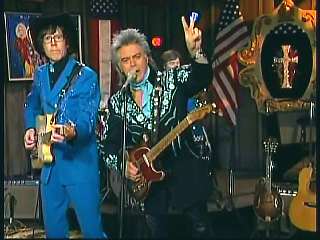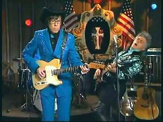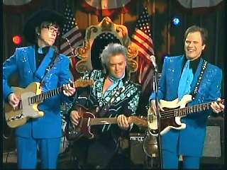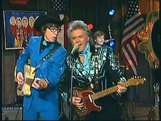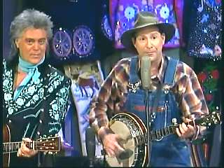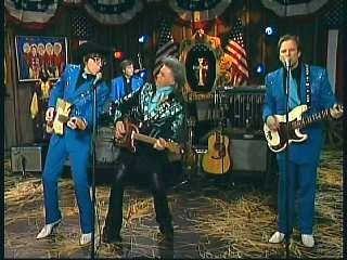 Marty said, "All right." Eddie said, "Great job there. All the Superlatives, Marty Stuart pickin' the mandolin. Gary Carter playin' some pretty steel guitar there on 'I Will Always Love You'." Eddie promoted Marty's book of photographs, Country Music: The Masters. After a commercial break, Marty said, "Hey, we gotta send out a Superlative salute to all of our friends in Hattiesburg, Mississippi. You know it's the pine belt. Home of the Armed Forces Museum at Camp Shelby. It's a place that honors the services and sacrifices of many of Mississippi's true heroes and heroines. And I suggest as soon as you're through at the museum at Camp Shelby, get in your car and head up I-40 to Pigeon Forge, Tennessee and go to ......." Dolly said, "Dollywood, Dixie Stampede, Splash Country, shall I go on?" Marty said, "Go right ahead, go right ahead. That would be Dollywood. I love Dollywood. I do. I like the log ride. Speakin of log rides. Here's somethin' that'll take you on an adventure just as fun as the log ride. Ladies and gentlemen, the ole Sultan of Goodlettsville, the most popular man in country music, the ole Tennessee Slicker. How 'bout a hand for our friend Leroy Troy. Come here, Leroy. Hey, Hello buddy boy. Looka here. I wish you'd look. You know Dolly and Connie, yes. How 'bout that."