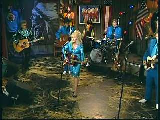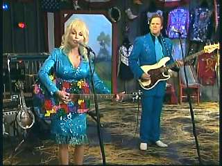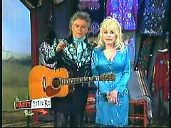 Marty said, "Yes sir. Tore that wood pile completely down. A profound song. Welcome to The Marty Stuart Show. I'm Marty Stuart. Aww, we got some great country music for ya for the next 30 minutes right here on RFD-TV. Here she comes, boys. I tell ya what. She's called herself the Smoky Mountain Nightingale. Representing East Tennessee. How 'bout a hand for our friend, the great Dolly Parton. Where are ya, Dolly, Dolly. Hey. Awww." Dolly said, "Hello Marty. How are you." Marty said, "It's all yours." Dolly said, "Thank you so much for having me. Well, look a there. They're standin' up. Sit down.I ain't that special. But I do have my Coat of Many Colors guitar for ya today. This is in honor of all your rhinestones. And I just wanna tell ya how happy I am to be part of this show. It just takes me back in time. And here's a little song that takes me back even farther to my childhood. It's a true story. And I always think of my own mama when I sing this song, so I always like to dedicate it to all the good mamas listenin'." Dolly sang "Coat Of Many Colors."