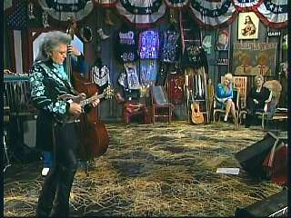 Marty said, "Just like that. Atta girl." Dolly said, "Thank you, thank you." Eddie said, "Great job right there. An autobiographical song from Miss Dolly Parton there that she wrote. 'Coat Of Many Colors'. Accompanying herself on a guitar of many colors. Great job, Dolly." Eddie promoted the two DVD set of highlights from the first season of The Marty Stuart Show. After a commercial break, Marty said, "Welcome back ladies and gentlemen. Hey Superlatives. Look over here. Global icon on the set. Prettyin' up the set. Miss Dolly. yes sir. Speakin' of icons and prettyin' up the set, here she comes right now. More, more, more. Right through the door comes the great Connie Smith. Come here Constance. Hey baby. Yeah. Hi baby." Connie performed "Hinges On The Door."