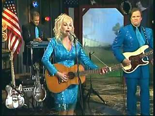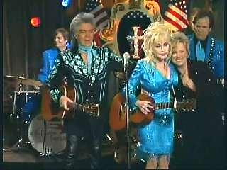 Marty said, "That was great, Constance. Oh look now. Look now. Talk about a hen house. I don't know about you two. I don't know about that. I tell ya. We're big fans of Dolly Parton at our house, aren't we not, Constance? I love Miss Dolly. Always have. Dolly's kinda like a diamond, you know. You can hold her up and there are so many facets to her. She's a great actress. She's a great singer. So many great things, but tell ya one of the things I love most about her is her songwriting. It should never be overlooked the importance of Dolly Parton's contributions to the great American song book. That's true. Pickin' one favorite is mighty impossible, but right now Mr. Carter and I would like to do a song of Miss Dolly's. It's called 'I Will Always Love You'." Dolly said, "It better be good." Marty said, "Aww, okay. It will. Remember, you get whatcha pay for."