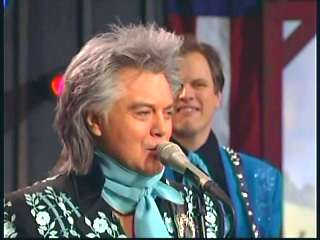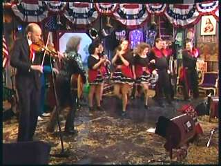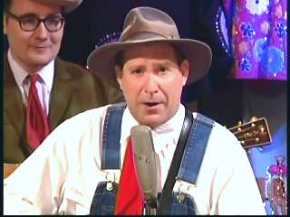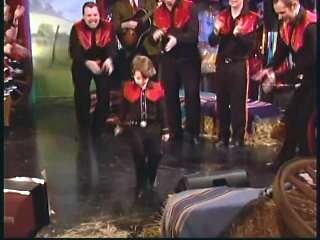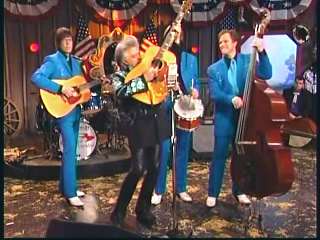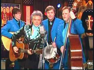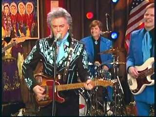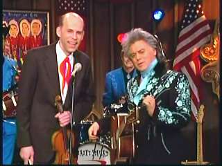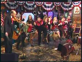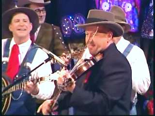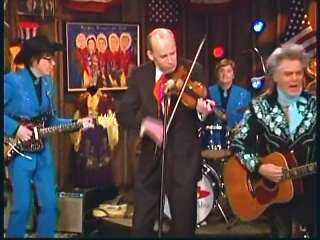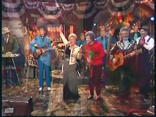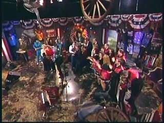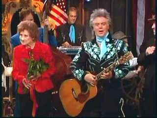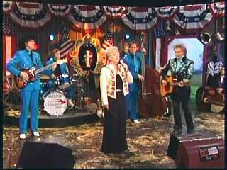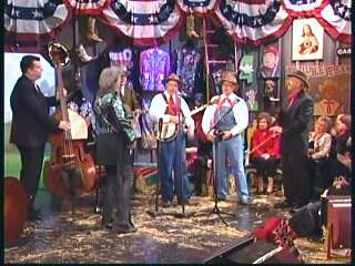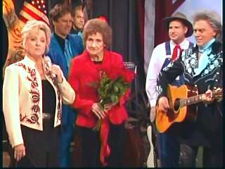 Marty said, "Stop the world ....." Marty hands his guitar to Paul. " Here ya go Apostle." "This is a special edition of our show today. We are here to pay honor and give a command performance to bring all our country hearts to our Queen of Country Music. How 'bout a hand for Miss Kitty Wells, ladies and gentlemen." Kitty waves to the audience. Marty continues, "We love you. You betcha. Eddie Stubbs, need to talk to ya. How 'bout a hand for Mr. Stubbs, ladies and gentlemen. Lookin' good today, sir." Eddie said, "Thank you, sir." Marty said, "Hey, we owe a big 'thank you' to Johnny Wright and Kitty Wells for bringin' you to town." Eddie said, "They did indeed back in 1995." Marty said, "Well, thank ya'll very much for givin' us Eddie Stubbs. Yeah. I heard you play a fiddle tune on their show one time called 'Bile Them Cabbage Down'". Eddie said, "And Johnny used to sing it." Marty said, "He could do it, he could do it. And I tell ya what. When Eddie Stubbs starts to fiddle, the Grand Ole Opry Square Dancers, the great Grand Ole Opry Square Dancers gonna come chargin' through that door and salute Miss Kitty Wells. Cousin, Handsome, Apostle, Edwardo, kick off the fiddle tune."