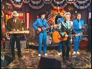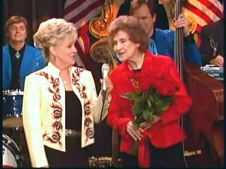 After a commercial break, Eddie Stubbs promoted the Superlatone Store. Eddie said, "And once again, here on our command performance, here's Marty Stuart." Marty said, "Thank you, Eddie Stubbs. And on behalf of all the folks on this show, you are our Queen and we love you very much." Kitty said, "Thank you." Marty continued, "Leroy, give our Queen some flowers. Leroy's gotcha some flowers. Everybody on this show loves you to pieces. That girl there may love ya a bit more than the rest of us." Kitty said, "Thank you." Marty said, "All right. Constance, we might oughta sing the national anthem, whataya think?" Connie said, "I think so." Marty said, "All right, gentlemen. 'It Wasn't God Who Made Honky Tonk Angels' for Miss Kitty." Kitty Wells joined in on the last chorus.