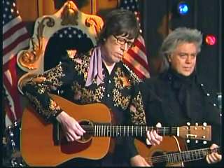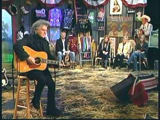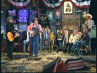 Marty said, "Thanks." Eddie said, "Fine job, Marty, right there with his D-45 Martin guitar and a medley of 'Soldier's Joy' and the 'Black Mountain Rag'. Marty, you're gettin' hot there up there where the money was a few times." Marty said, "I'm tellin' you boy. I'm tellin' you." Eddie promoted Marty's book of photographs, Country Music: The Masters. After a commercial break, Marty said, "That's the way it is, that's the way it is. Hey ladies and gentlemen. Welcome back to The Marty Stuart Show. First of all, write us at the Grand Ole Opry. We'd love to hear from ya. Or come see us at the Grand Ole Opry over there. Eddie Stubbs is always there. Connie's there from time to time. Me and The Superlatives are there. But if you're ever in Mississippi, here's what I might suggest to ya. Go to Jackson, Mississippi, the capital city. And I encourage you to visit the old State House Museum for a fine Southern experience. While you're there, go by the Governor's mansion. It's the second oldest continuously occupied residence of four United States Governors. Just knock on the door and tell the Gov that Marty and the Apostle sent ya. He'll be glad to see ya. He's a nice feller, don't you think?" Paul said, "Good man." Marty said, "Good man. Speaking of good men, here comes one right now. The most popular man in country music, the Sultan of Goodletsville, ladies and gentlemen. The ole Tennessee Slicker. How 'bout a hand for Leroy Troy. Leroy. Hey buddy. I wish you'd look over here. Fine, fine, fine, fine."